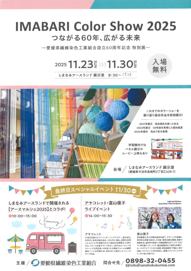 11月23日から30日までしまなみアースランド展示室にて色彩空間と体験プログラム「IMABARI Color Show 2025」が今年も開催されます。7色の色糸で再現した瀬戸内海と来島海峡大橋にかかる虹や過去の展示物を展示します。ワークショップ、オープンファクトリーも同時開催の予定です。