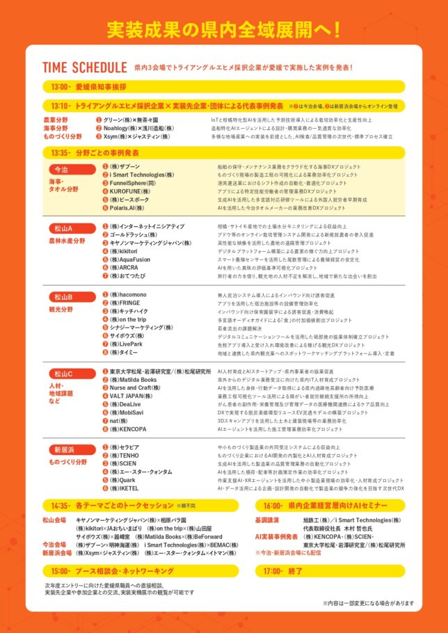 愛媛では、松山・今治・新居浜の3会場で同時開催し、愛媛県内事業者とデジタル企業が共創して取り組んだ、AI・IoT等を活用したデジタル技術の実装事例の発表を行います。
